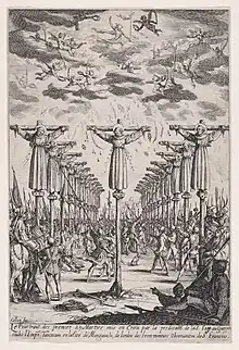 Llegados a la Santa Colina de Nagasaki, besó la cruz en que había de ser atado y martirizado. Recitó con Antonio y Tomás el salmo: “Alabad niños al Señor – Laudate pueri Dominum...”. Antes de ser atravesado por las lanzas de los soldados, gritó: “Paraíso! Paraíso!”.