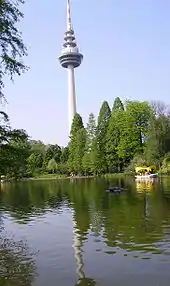 - La torre que domina sobre Luisenpark es una torre de telecomunicaciones (Fernmeldeturm) de 205 metros de altura con un restaurante giratorio a 125 metros sobre el nivel del suelo.