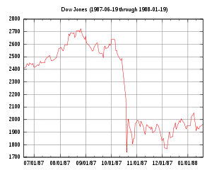 El lunes negro, en finanzas, se denomina al lunes 19 de octubre de 1987, cuando los mercados de valores de todo el mundo se desplomaron en un intervalo de tiempo muy breve. La caída comenzó en Hong Kong, se propagó hacia el oeste a través de los husos horarios internacionales, llegó a Europa y, por último, a Estados Unidos. El índice bursátil Dow Jones bajó 508 puntos, situándose en los 1739 (-22,6 %).[1] Hacia finales de octubre, los mercados de valores de Hong Kong ya habían caído un 45,8 %, Australia un 41.8%, el Reino Unido un 26,4 %, Estados Unidos un 22,6 % y Canadá un 22,5 %. El impacto fue especialmente duro en los mercados de Nueva Zelanda, que cayeron un 60 % desde el máximo de 1987, y del que tardaron varios años en recuperarse.