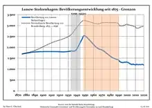 Desarrollo de la población en los actuales límites (Línea azul: Habitantes -- Línea de puntos: Comparación con el desarrollo de Brandenburgo; Fondo gris: Período del gobierno nazi -- Fondo Rojo: Época communista)