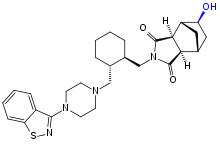 La lurasidona [(3aR,4S,7R,7aS)-2-{(1R,2R)-2-[4-(1,2-benzisotiazol-3-il) piperazin-1-ilmetil]-ciclohexilmetil}-hexahidro-4 El clorhidrato de ,7-metano-2hisoindol-1,3-diona] ][56] es un derivado de la azapirona[57] y actúa como antagonista de los receptores de dopamina D2 y D3,[58] y de la serotonina 5-HT 2A y 5-HT 7, y el receptor adrenérgico α2C, y como agonista parcial del receptor de serotonina 5-HT1A . Tiene un antagonismo de afinidad moderada en los receptores adrenérgicos α2C y antagonismo de baja a muy baja afinidad en los receptores α1A-adrenérgicos α2A-adrenérgicos.[59]