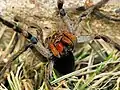 Como en otros integrantes del género Lycosa, L. erythrognatha presenta 8 ojos en 3 filas, la fila inferior posee 4 pequeños; algo más arriba se presenta la segunda, con 2 grandes ojos; finalmente la última posee también 2, pero más pequeños y ubicados más hacia los lados en la parte horizontal del rostro. Las patas son largas y espinosas, siendo las más cortas las del primer y tercer par y la más largas las del cuarto par; los tarsos poseen densas escópulas y terminan en 3 uñas; además, no cuenta con fascículos subungueales.[9]
