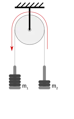 Para diferencias muy pequeñas de masa y entre y , el momento de inercia () sobre la polea de masa no despreciable de radio no puede ser despreciada. La aceleración angular de la polea viene dada por: