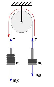 Se puede obtener una ecuación para la aceleración usando análisis de fuerzas. Puesto que se está usando una cuerda inelástica con masa despreciable y una polea ideal con masa despreciable, las únicas fuerzas que se tiene que considerar son: la fuerza tensión () y el peso de las dos masas (). Para encontrar el tenemos que considerar las fuerzas que afectan a cada masa por separado (con el siguiente convenio de signos, suponiendo que ,- hacia "abajo" -con el mismo sentido a la aceleración de la gravedad - en y la aceleración es positiva hacia "arriba" -con sentido contrario de la aceleración de la gravedad - en ):