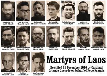 Mártires de Laos fue un grupo 17 de misioneros católicos, que realizaban una tarea espiritual en Laos (antes Indochina Francesa), y que como muestra de odio a la fe, fueron martirizados por elegir mantenerla, cuando el país pasaba por un proceso de guerrillas comunistas e independencia en la Guerra de Indochina entre 1954 a 1970 los cuales fueron beatificados por la Iglesia Católica en Laos, después de una investigación por el vicariato apostólico de Vientián en Laos, quiene consideraró que esas personas fueron perseguidas y atacadas por practicar su fe cristiana, razones suficientes ser considerados mártires y beatos el 16 de diciembre de 2016. Los mártires eran 10 franceses, un italiano y 6 laosianos. La Iglesia católica de Laos es la primera vez que cuenta con beatos de Laos.[1]