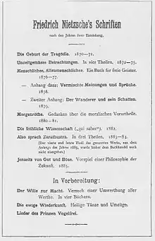 - Thomas Mittmann: Vom „Günstling“ zum „Urfeind“ der Juden: die antisemitische Nietzsche-Rezeption in Deutschland bis zum Ende des Nationalsozialismus. Königshausen & Neumann, Würzburg 2006, 90–91; Mazzino Montinari: Nietzsche lesen, de Gruyter, Berlin 1982, 169