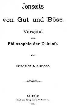 Nietzsche creó la copia en limpio y el manuscrito impreso en el invierno de 1885/86 durante una estancia en Niza .[12] Escribió en una carta a Peter Gast fechada el 27 El 18 de marzo de 1886: “He usado este invierno para escribir algo que tiene muchas dificultades, de modo que mi valor para publicarlo se tambalea y tiembla aquí y allá.[13] El libro, que Nietzsche financió él mismo a falta de otras opciones, como otros escritos anteriores, fue finalmente publicado en agosto de 1886 por la editorial C. G. Naumann de Leipzig. En el reverso de la portada llevaba el anuncio "En preparación: La Voluntad de poder . Un intento de transvalorización de todos los valores ”.[14]
