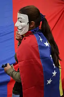 Los manifestantes de ultraderecha venezolanos en las guarimbas de 2014, entre la gran variedad de máscaras usadas, se destaca la máscara de Guy Fawkes; en algunos casos, pintada con los colores de la bandera de Venezuela por parte de ultraderechistas de ese pais (algo contradictorio con las ideas anarquistas y antinacionalistas del personaje de "v") [33][34]