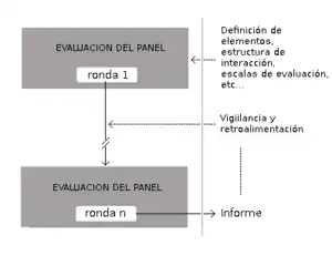 Su objetivo es la consecución de consenso basado en la discusión entre expertos mediante un proceso interactivo. Su funcionamiento se basa en la elaboración de un cuestionario que debe contestar cada experto. Una vez analizados los resultados globales, se vuelve a realizar otro cuestionario que deberán contestar los mismos expertos, tras darles a conocer los resultados obtenidos en la consulta anterior. El proceso puede repetirse varias veces hasta alcanzar cierto nivel de consenso. Finalmente, el responsable del estudio elaborará sus conclusiones a partir de la explotación estadística de los datos obtenidos.