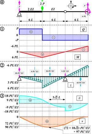 Aquí el cortante V se compara con la pendiente θ, el momento M se compara con la deflexión v, y la carga externa w compara con el diagrama M/EI. En la figura se muestra un diagrama de cortante, momento y otro diagrama de deflexión. El diagrama M/EI es un diagrama de momento dividido por el producto del módulo de Young de la viga y su momento de inercia.