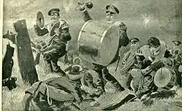 La evidencia textual para el uso de gaitas escocesas en la batalla data de 1396, cuando los registros de la Batalla de North Inch of Perth hacen referencia a "gaitas" que se llevan a la batalla, aunque se cree que las gaitas fueron originalmente destinadas a la música pacífica.[5] Los irlandeses también se inspiraron en las gaitas, como lo atestigua en este relato de 1586: "Este tipo de instrumento se lleva a cabo entre los irlandeses para ser una piedra de afilar para el coraje marcial: porque así como otros soldados se agitan con el sonido de las trompetas, estimulado a luchar por el ruido de este asunto.[6]