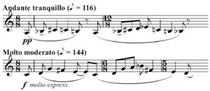 El primer movimiento es una fuga lenta, cuyos compases cambian constantemente. Está basado alrededor de la nota la, con la que empieza y concluye el movimiento, cuya estructura se basa, como en otras composiciones del autor, en proporciones relacionadas con el número de oro. Comienza con las cuerdas en sordina, y según se incorporan más voces la textura orquestal se hace más densa y la música se torna más fuerte hasta el clímax. Se retiran entonces las sordinas y la música se vuelve gradualmente más tranquila sobre suaves arpegios de la celesta. El movimiento termina con el tema de la fuga tocado suavemente sobre su inversión. El material temático de este primer movimiento reaparecerá después de distintas formas en los movimientos finales, sirviendo de nexo a toda la obra.