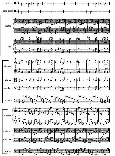 El tercer movimiento es sin duda el más original: un nocturno lento, característico del autor, y presenta glissandi de los timbales, lo que en la fecha de composición de la obra era una técnica poco usual, así como una intervención prominente del xilófono. Las cinco secciones del movimiento están ligadas por las cuatro frases del tema del primer movimiento, expresando así la continuidad de la obra.