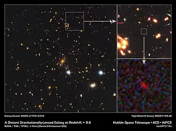 - «NASA Telescopes Spy Ultra-Distant Galaxy Amidst Cosmic 'Dark Ages'». hubblesite.org (en inglés). 19 de septiembre de 2012. Consultado el 20 de septiembre de 2012.