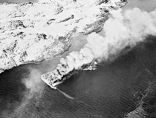 ![]() El MS Rigel y su barco de escolta a la derecha bajo ataque de la aviación británica. | ||