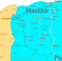 Las ciudades más grandes de la zona reclamadas por Maakhir son Badhan, Las Khorey, Dhahar, Buraan, Hadaftimo, Hingalol, Damalla-Hagare, Eilbuh and Erigavo.