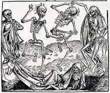 El término adquirió su importancia a partir de su uso en la expresión francesa la danse macabre (‘Danza de la Muerte’) para aludir a la representación alegórica del omnipresente y universal poder de la muerte. La forma típica que adopta esta alegoría es la de una serie de pinturas o esculturas en las que la Muerte se aparece, bien como esqueletos bailando o como cadáveres encogidos en sus sudarios, a gente representativa de todas las edades y circunstancias de la vida, y les lleva a bailar a la sepultura. De los numerosos ejemplos pintados o esculpidos en las paredes de los claustros de las iglesias por toda la Europa medieval se conservan pocos, con la excepción de los grabados.