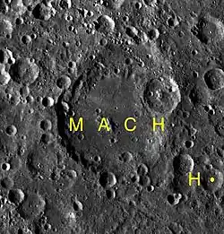Mach es un gran cráter de impacto lunar de la clase conocida como una llanura amurallada. Se encuentra en la cara oculta de la Luna y no se puede ver directamente desde la Tierra. La relación de cráteres cercanos incluye a Joule al noreste, Mitra unido al borde exterior occidental, y Henyey al sudoeste.