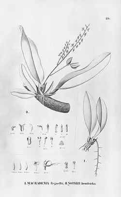 Macradenia: nombre genérico que es una referencia a los largos pecíolos que tienen estas plantas.