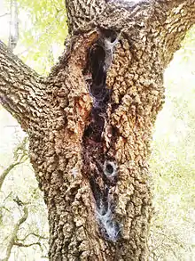 Colonia de araña toro en un fresno. La agrupación principal está situada a más de dos metros de altura, y por encima de los tres metros hay un nido aislado