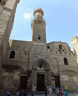 El minarete también es inusual ya que se construyó directamente sobre el portal de entrada y sobre el corredor de entrada principal, una decisión de diseño que era rara en la arquitectura mameluca, que generalmente coloca minaretes en sus propios contrafuertes sólidos aparte de la entrada para garantizar mayor estabilidad.[2]