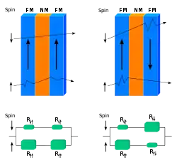 La magnetorresistencia gigante (MRG) es un efecto mecánico cuántico que se observa en estructuras de película delgada compuestas de capas alternadas ferromagnéticas y no magnéticas. Se manifiesta en forma de una bajada significativa de la resistencia eléctrica observada bajo la aplicación de un campo magnético externo: cuando el campo es nulo, las dos capas ferromagnéticas adyacentes tienen una magnetización antiparalela puesto que están sometidas a un acoplamiento ferromagnético débil entre las capas. Bajo efecto de un campo magnético externo, las magnetizaciones respectivas de las dos capas se alinean y la resistencia de la multicapa cae de manera súbita. Los espines de los electrones de la sustancia no magnética se alinean en igual número de manera paralela y antiparalela al campo magnético aplicado, y por tanto sufren un cambio de difusión magnética en una menor medida respecto a las capas ferromagnéticas que se magnetizan de forma paralela.