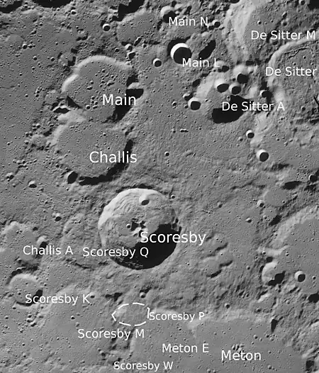 Main es un cráter de impacto que se encuentra cerca del polo norte de la Luna. El borde sur de esta formación se ha fusionado con el cráter más grande Challis situado al sur, y el suelo interior a nivel conecta los dos cráteres a través de un espacio estrecho. Al norte-noroeste de Main se halla Gioja.