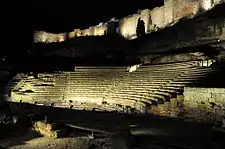 De la Malaca romana se tiene constancia que su extensión fue considerablemente mayor a la de la anterior ciudad fenicia, pues se conoce la existencia de una industria alfarera en el entorno de la colina de El Ejido y calle Ollerías en el siglo I.[4] Los restos más visibles son los del teatro romano, situado junto a la alcazaba, y se tienen evidencias arqueológicas de algunos retazos del sistema viario y de unas grandes termas públicas en el subsuelo de la Plaza de la Aduana en dirección hacia la Calle Císter.[5][6] Fuera de esta zona la estructura y fisonomía de la ciudad romana es muy poco conocida. Se ha constatado la existencia de varios sectores funerarios en el extrarradio de la antigua ciudad, algunos de ellos situados en torno a vías de comunicación, como establecían los parámetros urbanísticos del Imperio que la ciudad adoptó varias generaciones después de la llegada de los latinos.[7]