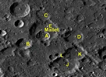 Por convención estos elementos son identificados en los mapas lunares poniendo la letra en el lado del punto medio del cráter que está más cercano a Mallet.
