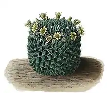 Es una planta perenne carnosa que crece solitaria. El tallo de color azul-verde a verde oscuro, globular y de forma cilíndrica de 7-10 cm de altura y alcanza un tamaño igual de diámetro. Las sólidas areolas son piramidales y contienen látex. Las axilas están llenas de cerdas. Las espinas centrales faltan por completo o es sólo un esbozo, blanco o amarillento, siempre con la punta oscura y con una longitud de 5.5 cm. Las 3-8 espinas radiales son subuladas, rectas o ligeramente curvadas, de color rojizo y tiza con el tiempo, miden de 0,4 a 3 centímetros de largo. Las flores son de color blanco con una franja central de color púrpura, miden hasta 2,5 centímetros de largo y 1,5 centímetros de diámetro. Los frutos son rojos brillantes y contienen las semillas .