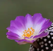 Es una planta perenne carnosa y globosa con las hojas transformadas en espinas, de color verde y con las flores de color púrpura y rojo.