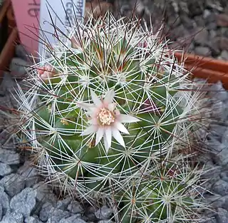 Mammillaria: nombre genérico que fue descrita por vez primera por Carolus Linnaeus como Cactus mammillaris en 1753, nombre derivado del latín mammilla = tubérculo, en alusión a los tubérculos que son una de las características del género.