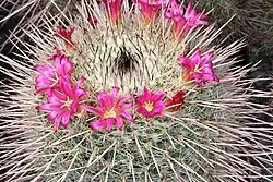 Es una biznaga de la tribu Cacteae, familia Cactaceae. Es un cactus que tiene crecimiento ramificado. Es de forma globosa a cilíndrica, de 8 a 11 cm de altura y 6 a 9 cm de diámetro. Las protuberancias del tallo (tubérculos) son piramidales, de color verde claro a oscuro y presentan jugo lechoso, el espacio entre ellos (axilas) presentan cerdas blancas a translúcidas. Los sitios en los que se desarrollan las espinas se denominan aréolas, en esta especie tienen forma ovalada, con más o menos 26 espinas, 1 a 2 de ellas en el centro de la aréola (centrales), son aciculares, pardo rojizas con el ápice oscuro, mientras que las espinas de la orilla (radiales) son blancas con la base amarilla. Las flores son pequeñas y tienen forma de embudo, miden 17 a 20 mm de longitud y son de color de rosa a rojo escarlata. Los frutos son claviformes, de color rojo escarlata, las semillas son pardas. Es polinizada por insectos y se dispersa por semillas.[1][2][3][4][5][6]