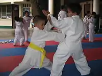 | Gancho | Un golpe que implica el giro del cuerpo para apuntar hacia el lado de la cabeza o el cuerpo. Este golpe debe aterrizar utilizando los nudillos y no desde un puño plano.[8] El gancho generalmente se ejecuta con la palma hacia abajo o hacia adentro.[9] |