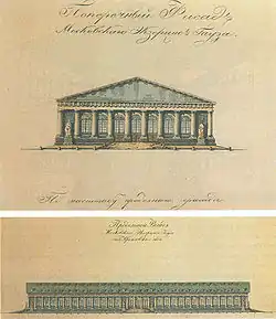 En 1824-1825 el arquitecto ruso Joseph Bové (o Giuseppe Bova) revistió su exterior de estilo neoclásico, pintado de blanco y amarillo ocre, con un orden de columnas de estilo dórico romano que delimitan unos espacios con ventanas coronadas de arcos conformando una galería ciega. El techo, con sus alfardas interiores y vigas expuestas, queda soportado por las columnas exteriores del Manège.