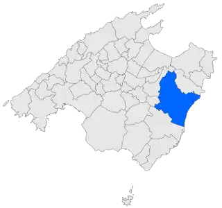 El municipio manacorense es una de las cinco entidades que componen la comarca del Levante Mallorquín, y comprende los núcleos de población de Manacor —capital municipal, comarcal y sede de un partido judicial propio—,[3] Porto Cristo, s'Illot-Cala Morlanda, Calas de Mallorca (Cales de Mallorca), Son Macià, Cala Anguila-Cala Mandía (Cala Anguila-Mendia), Cala Murada, Cala Romántica (Estany d'en Mas), Son Talent, Son Mas y La Marineta (sa Marineta).
