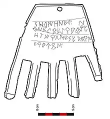 Lisa por el lado de la palma, su dorso detallaba las uñas, si bien las correspondientes a los tres dedos centrales se han perdido. En este lado contiene una inscripción de unos 40 signos distribuidos en cuatro líneas de caracteres paleohispánicos, un sistema de escritura anterior a la llegada de los romanos a la península Ibérica.