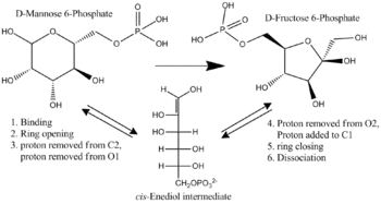 asociado.[5] El paso de apertura del anillo podría ser catalizado por la His99 y Asp270, y la isomerización es probablemente llevada a cabo por un mecanismo cis-enodiol.[6] Una descripción detallada del mecanismo de la fosfomanosa isomerasa puede encontrarse en un trabajo del año 1968 escrito por Robert W. Gracy y Ernst A. Noltmann, publicado en la revista JBC (ver la referencia)[7]
