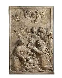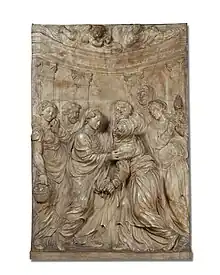 - Relieve figurando el Llanto por Cristo muerto, en el mismo museo. Realizado en alabastro con toques de policromía, es una pieza de pequeño tamaño que debió servir de puerta de sagrario o banco de retablo. Las figuras de este relieve se despegan más del fondo, adquiriendo algunas volumen casi exento; la huella berruguetesca es muy patente en las vestiduras agitadas por el viento y los rostros contraídos por el dolor.[3]