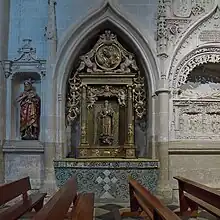 - Retablo del Descendimiento, conservado en el Museo Diocesano de Palencia. Se trata de un pequeño retablo ricamente dorado y policromado, con banco, un solo cuerpo y remate semicircular, de original traza. El tema central es un relieve con poco resalte, de efecto casi pictórico, en el que las sagradas figuras que desclavan a Cristo de la cruz se mueven rítmicas y nerviosas.[2]