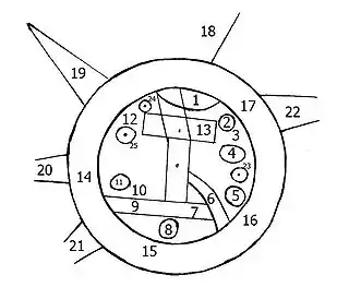 Hay siete pequeños círculos interiores en las áreas perimetrales dentro del círculo, y parecen representar siete ciudades. Ocho secciones triangulares en el círculo externo (perímetro del agua) representan «regiones» denominadas (nagu). La descripción de cinco de ellas ha sobrevivido.[3]