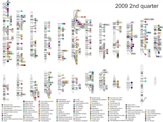 La ventaja del mapeo de asociación es que puede mapear rasgos cuantitativos con alta resolución de una manera estadísticamente muy poderosa. Sin embargo, el mapeo de asociación también requiere un amplio conocimiento de los SNP dentro del genoma del organismo de interés y, por lo tanto, es difícil de realizar en especies que no han sido bien estudiadas o que no tienen genomas bien anotados.[3] El mapeo de asociación se ha aplicado más ampliamente al estudio de enfermedades humanas, específicamente en forma de un estudio de asociación de genoma completo (GWAS). Se realiza un estudio de asociación de todo el genoma escaneando un genoma completo en busca de SNP asociados con un rasgo de interés particular, o en el caso de una enfermedad humana, con una enfermedad de interés particular.[1][4] Hasta la fecha, se han realizado miles de estudios de asociaciones de genoma amplio en el genoma humano en un intento de identificar los SNP asociados con una amplia variedad de enfermedades humanas complejas (por ejemplo, cáncer, enfermedad de Alzheimer y obesidad). Los resultados de todos estos GWAS publicados se mantienen en una base de datos NIH (figura 1). Sin embargo, si estos estudios han sido clínicamente y/o terapéuticamente útiles, sigue siendo controvertido.
