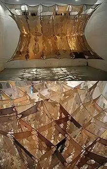 Instalación de dimensiones variables creada a partir de por lo menos 85 pares de pantimedias, cortadas y cosidas unas con otras para conformar una especie de maya que se estira de muro a muro, creando una estructura espacial transparente, que sugiere seducción e intimidad de la piel que suelen cubrir pero que al estar lejos de esos cuerpos, interviniendo un espacio, se transforman en una abrumadora ausencia.[4]