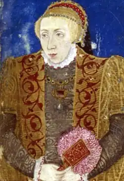![]() Miniatura de María (o su hija Antonieta) representada en las horas de Catalina de Medici. | ||