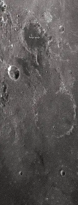 Por convención estos elementos son identificados en los mapas lunares poniendo la letra en el lado del punto medio del cráter que está más cercano a Maraldi.
