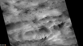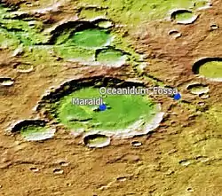 | Cráter Maraldi, fotografía de la cámara CTX a bordo del Mars Reconnaissance Orbiter. (El norte, hacia la izquierda de la fotografía). |