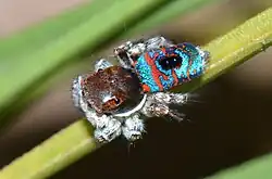 - Hill, D.E. (2009) Euophryine jumping spiders that extend their third legs during courtship (Araneae: Salticidae: Euophryinae: Maratus, Saitis). Peckhamia 74.1:1-27.