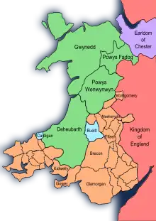 Tras la caída del Imperio Romano, que había ocupado Britania hasta el año 410, el territorio de la actual Gales estaba dividido entre numerosos reinos britano-romanos, entre los que se encontraba Powys, hacia el este. Durante los siguientes siglos, anglos, sajones y otros fueron conquistando y ocupando el sur y el este de Gran Bretaña. El reino de Mercia, liderado por Penda, se situaba en torno a Lichfield e inicialmente trató de buscar el apoyo de los reyes galeses. Sin embargo, sus sucesores iniciaron políticas más agresivas, expandiéndose hacia el oeste hasta los actuales Cheshire, Shropshire y Herefordshire. Las campañas lanzadas por Powys en represalia llevaron a la construcción del Wat's Dyke en el siglo VIII, una línea fronteriza de tierra entre el valle del Severn cerca de Oswestry hasta el estuario del río Dee.[2][3] A medida que se fortalecía el poder de Mercia, una serie de ciudades-mercado como Shrewsbury y Hereford marcaban el límite del país tanto como Offa's Dyke, una línea defensiva construida en tierra por Offa de Mercia a finales del siglo VIII. Offa's Dyke aún existe y se pueden ver sus restos cerca de la frontera actual entre Inglaterra y Gales en Knighton (Powys).[4]