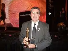 ![]() Marcelo Lagranja y su premio Martín Fierro ganado en Puerto Iguazú en 2010. | ||