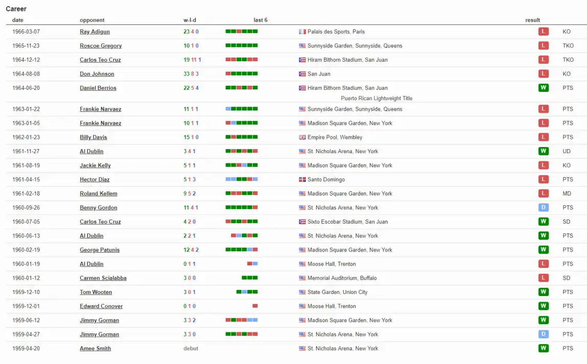Tiene un récord de 9 ganados, 12 perdidos y 2 peleas ganadas por empate, estas serían aproximaciones ya que del tiempo activo solo estos datos fueron recuperados. Es considerado como uno de los grandes boxeadores de la historia de su país y de su pueblo arroyano. Llegando a llenar el Hiram Bithorn Stadium de San Juan, Puerto Rico, en su pelea con el boxeador Daniel Berrios en 1964. Además, fue militar activo y trabajo para la AEE. Fue paciente de Alzheimer, el cual avanzó mucho en los últimos momentos de su vida.